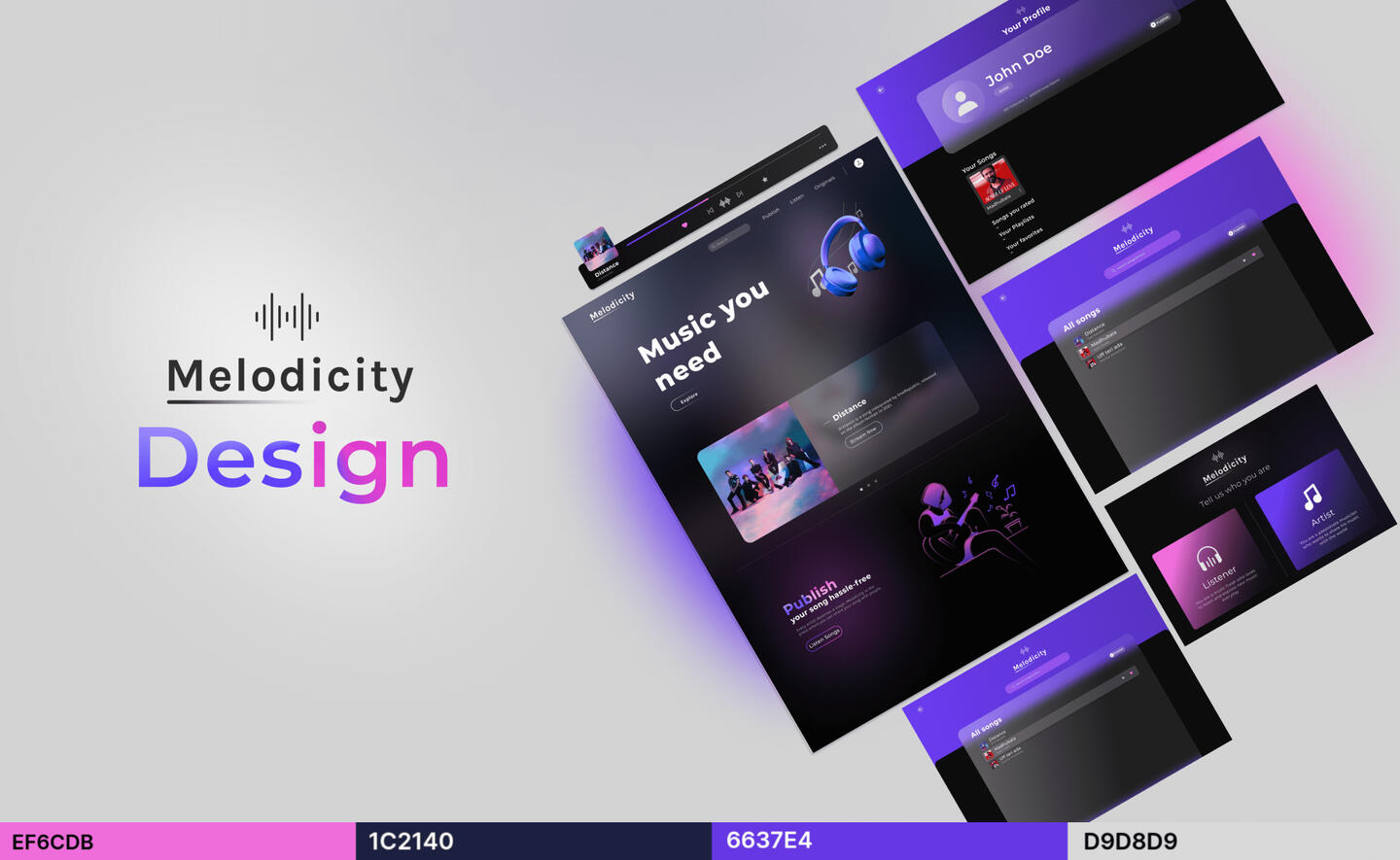 A web-based music streaming platform where Creators distribute new songs and Listeners explore diverse music genres. Built with a user-centered design, it prioritizes an intuitive experience for both creators and listeners. The platform's design encapsulates its musical essence through carefully curated colors, typography, and graphics, crafting a distinct visual identity.